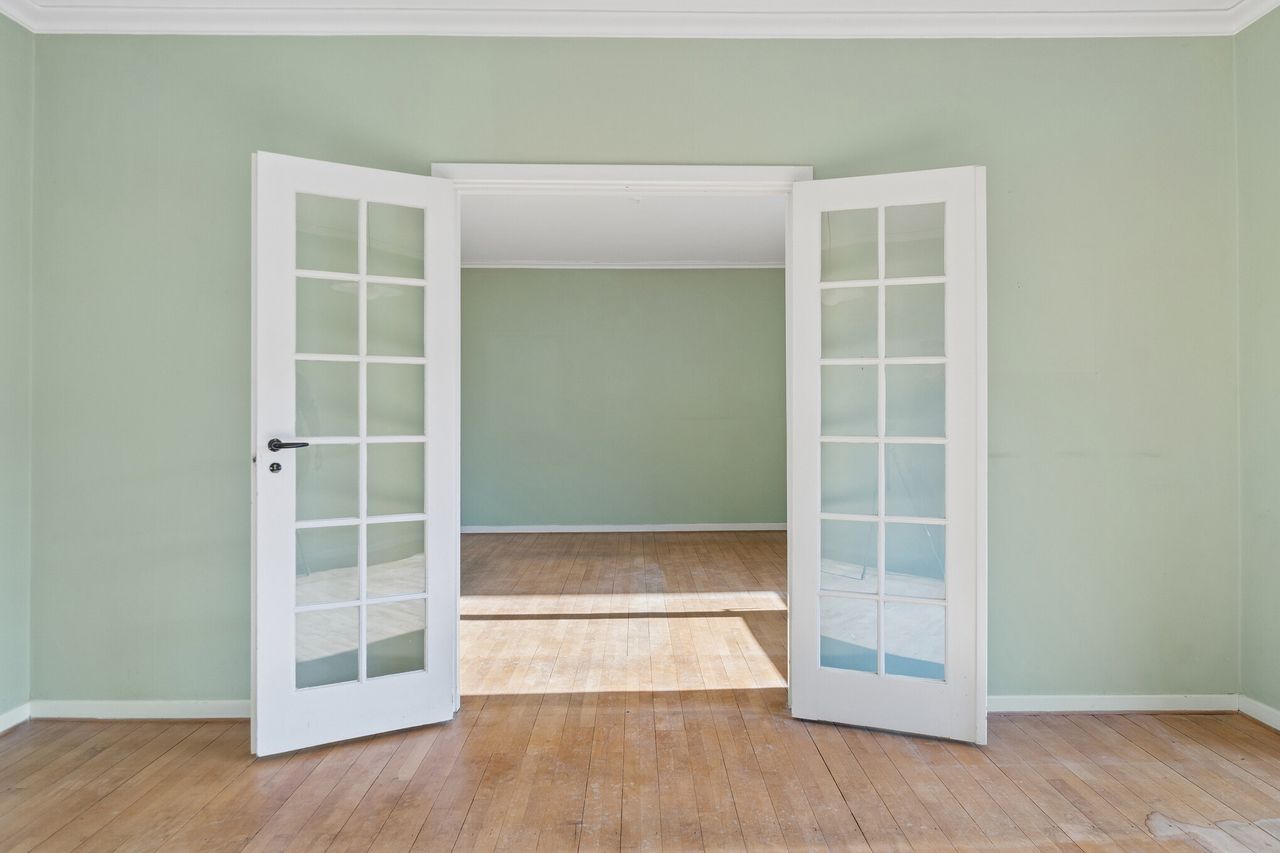 Lejligheden er på 91 m2 og en af de få lejligheder i bebyggelsen, der har entre, der fordeler til alle rum. Indeholder: entre med indbygget skab. Stor lys spisestue med franske døre til dejlig, stor opholdsstue, hvor der ligeledes er fransk dør fra entreen - begge stuer har dør til den dejlige, solrige sydvestvendte altan. Ældre køkken med god skabsplads. Brusebadeværelse med hvide vægfliser og grå gulvfliser. Stort soveværelse med udsigt over det grønne gårdmiljø. Parketgulve.