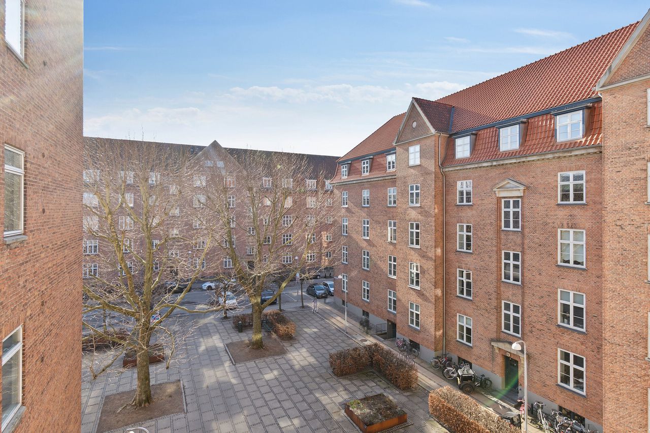 Stor 3 værelses ejerlejlighed med sydvestvendt altan og fri udsigt over Bjarkes Plads. Lejligheden ligger i den eftertragtede bebyggelse Aksel Møllers Have med altan og elevator. Mulighed for at ændre indretning til 4 værelses.